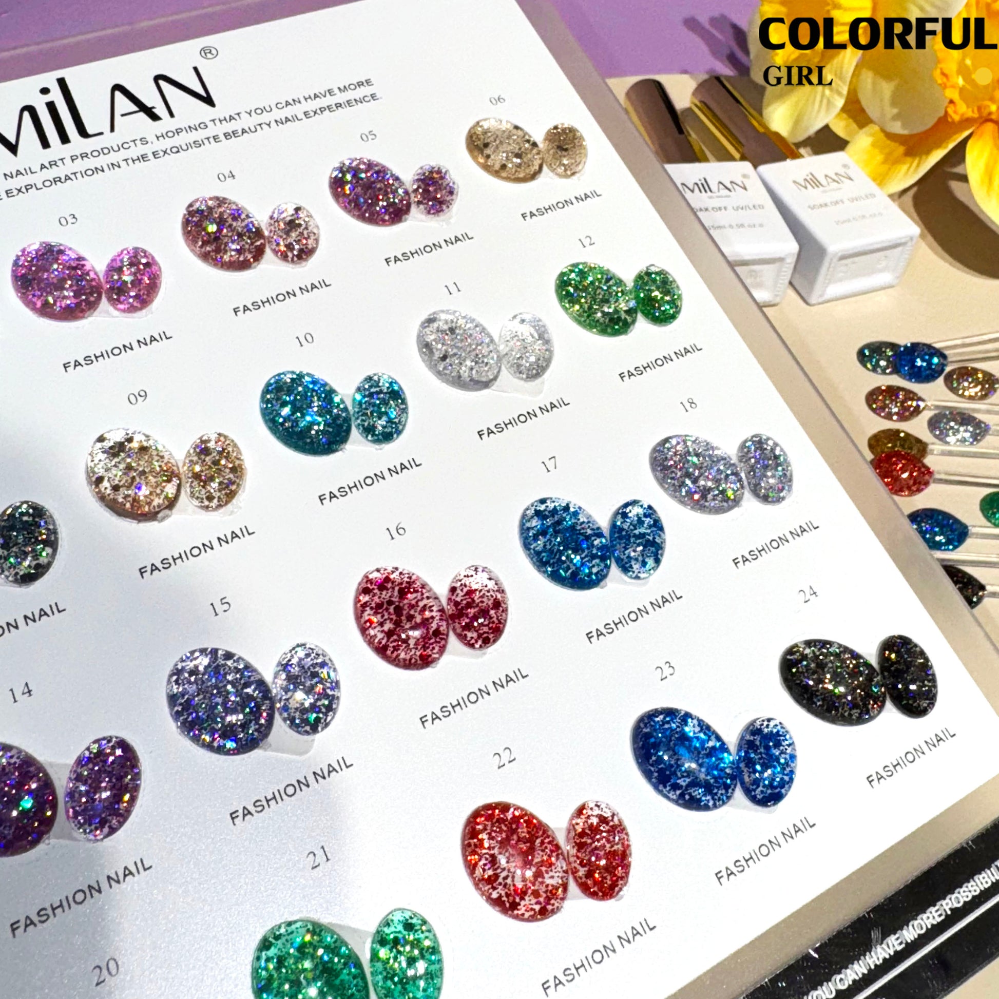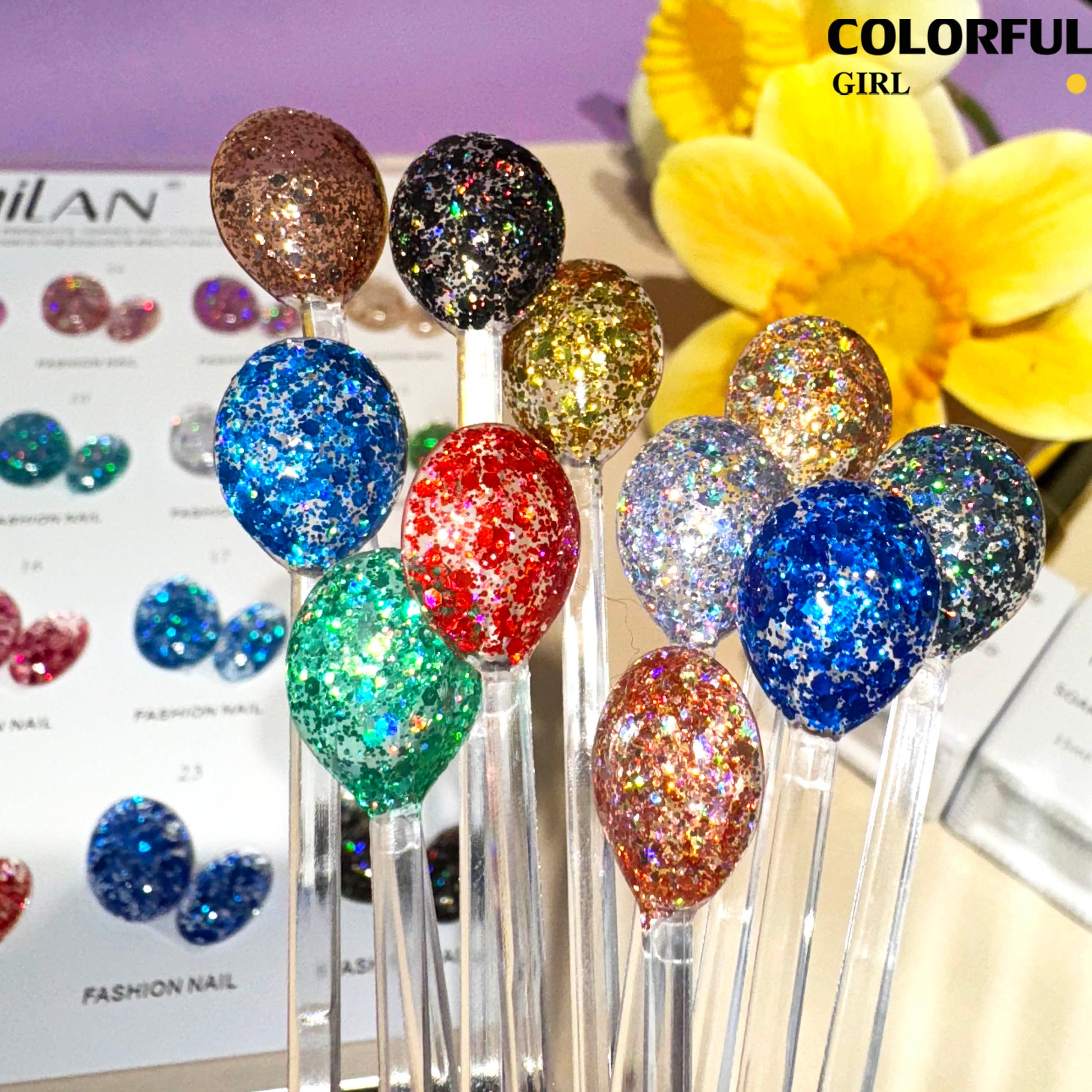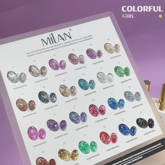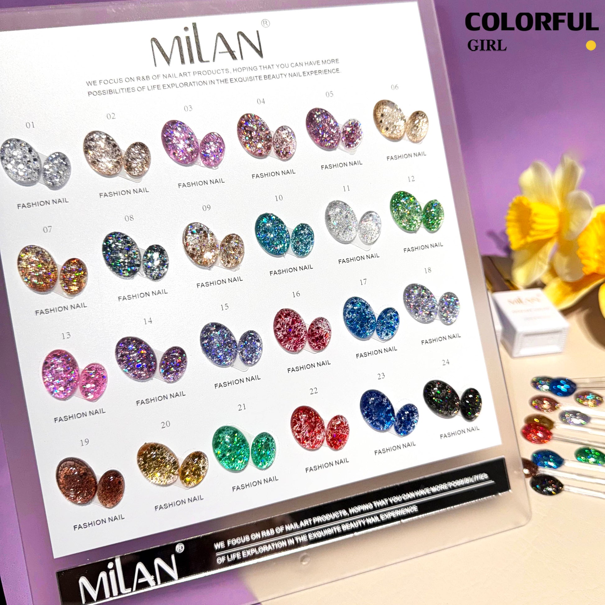 【พร้อมส่ง】สีสีเจล MILANสีกากเพชร สีเจลกลิซเตอร์ 24 สี แถม ชาร์ทสี(milan) สีเจลกลิซเตอร์