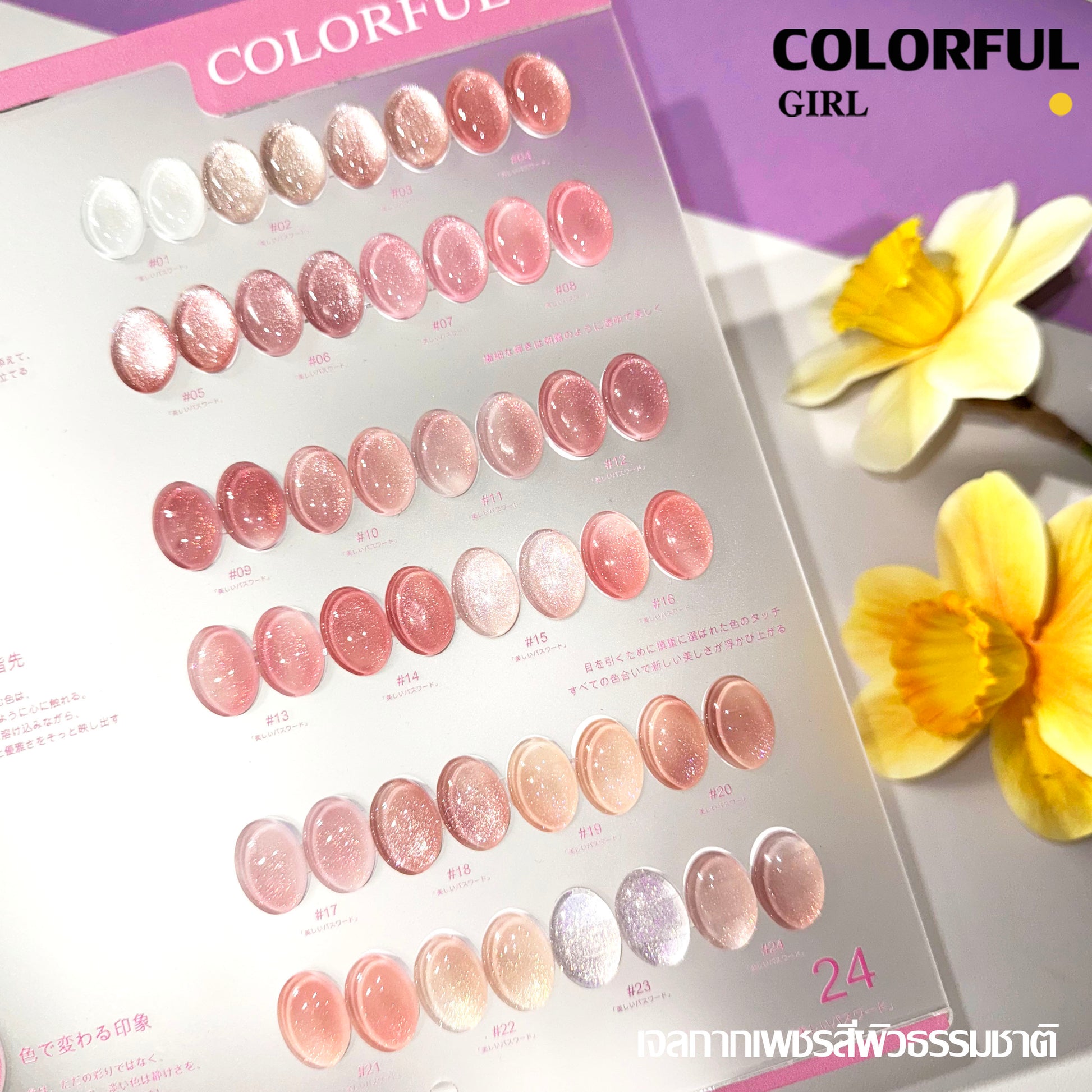 Colorful girl 24สี สีเจลแคทอายเนื้อซาติน สีเจลแฟลช เจลกากเพชรสีผิวธรรมชาติ สีเลเซอร์กากเพชรแฟลช แถมฟรีชาร์ทอะคริลิคสำเร็จรูป