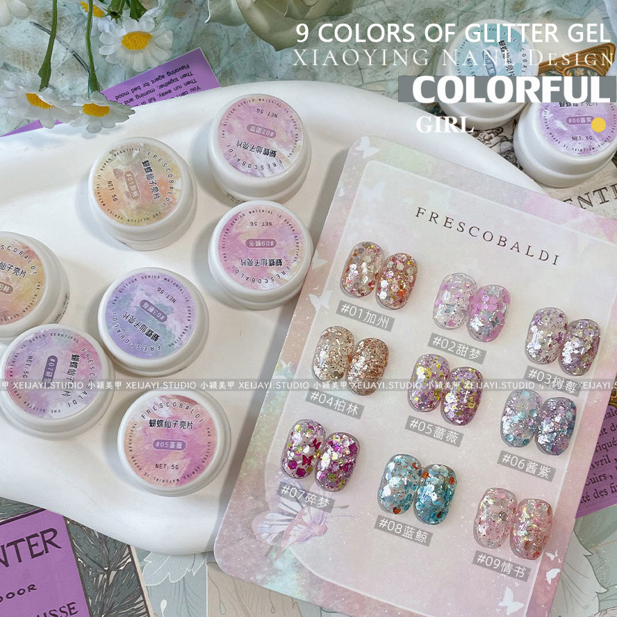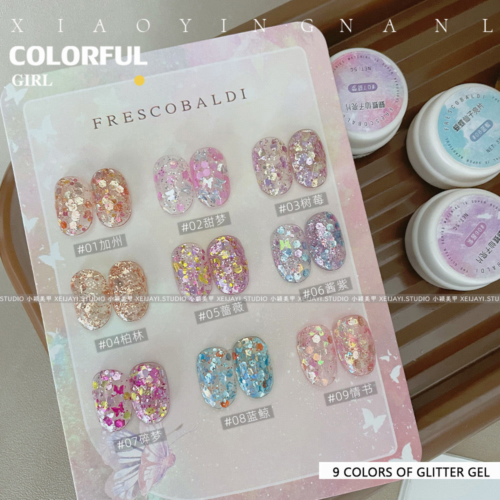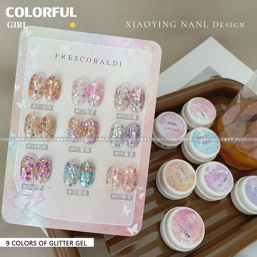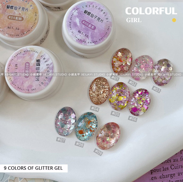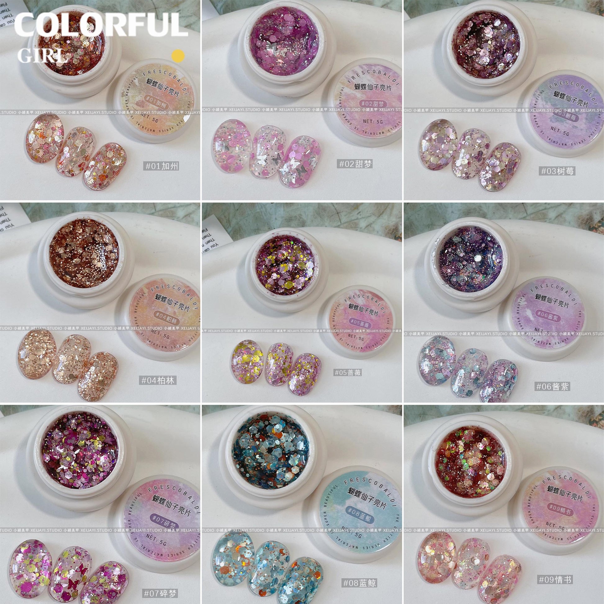 พร้อมส่ง เจลทาเล็บ Butterfly Fairy Series 9 สีเลื่อมวัสดุกาวเล็บ 5g กาวส่องไฟกระป๋อง Super Flash เลื่อมขนาดใหญ่ล้างฟรี Soaking ยาทาเล็บกาว
