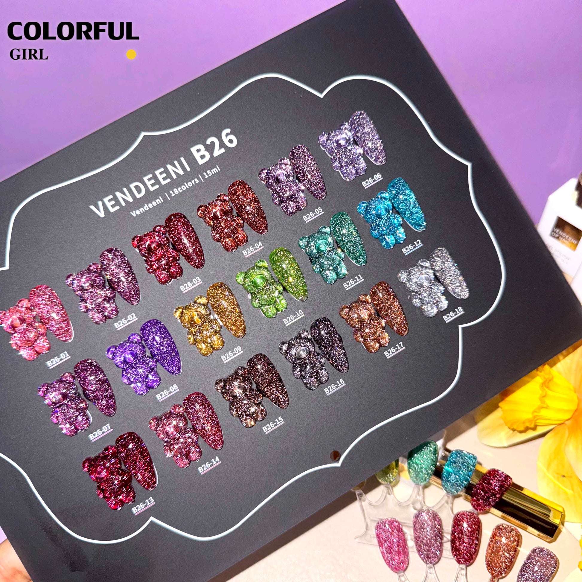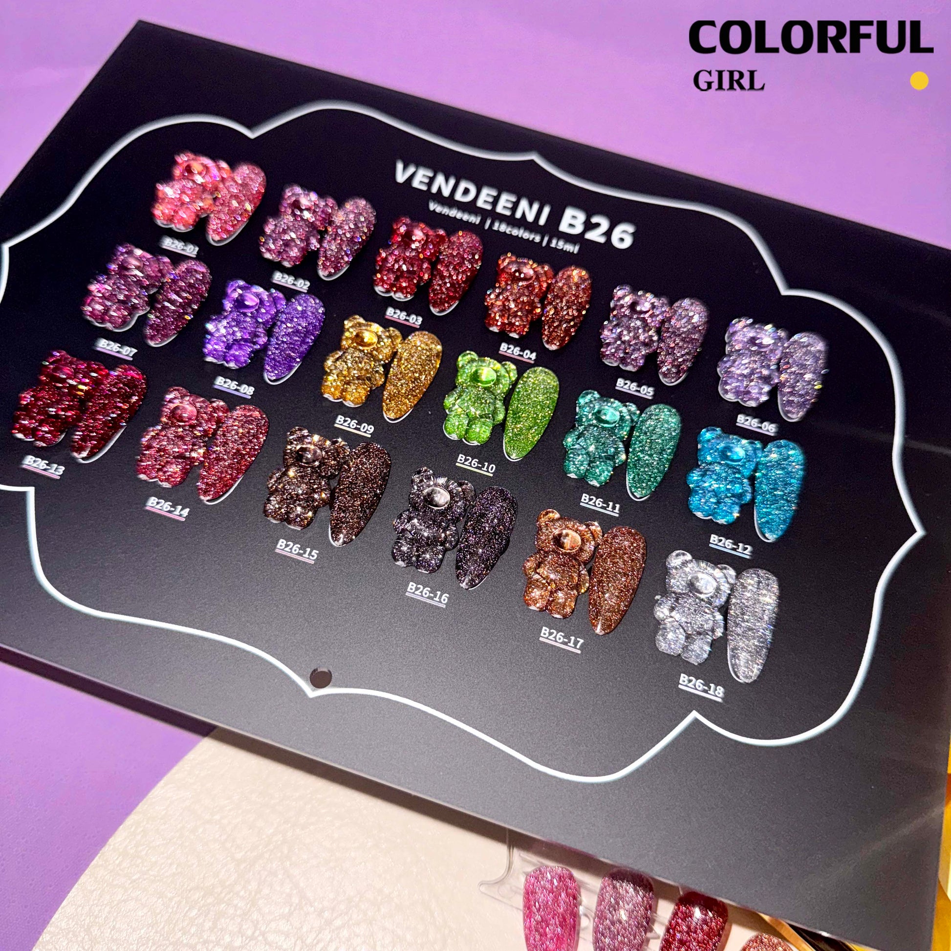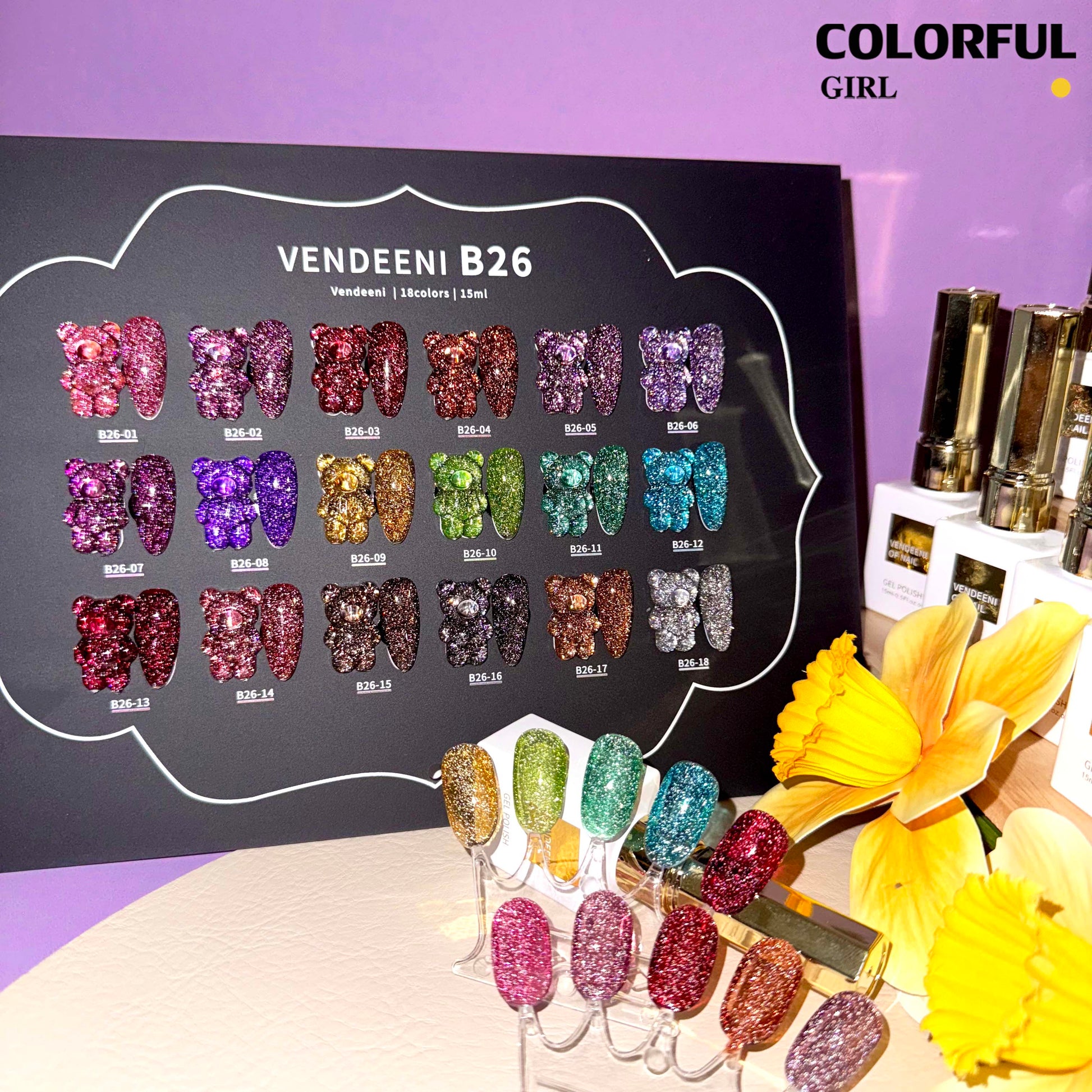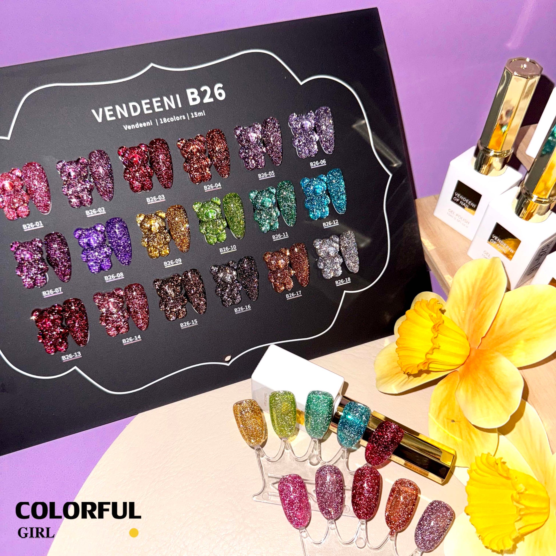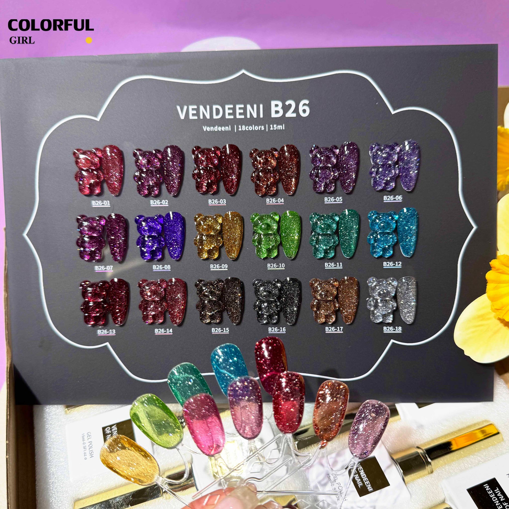 【พร้อมส่ง】VENDEENI สีเจลแฟลช 18สี (VENDEENI B26)สีเจลทาเล็บ สี แถม ชาร์ทสี ยาทาเล็บเจล ชุดสี 18สี + ฟรีชาร์ทสี พร้อมชาร์ทสีค่ะสีแน่นสวยมากเลยนะคะ เอฟเฟกต์มันเงามาก