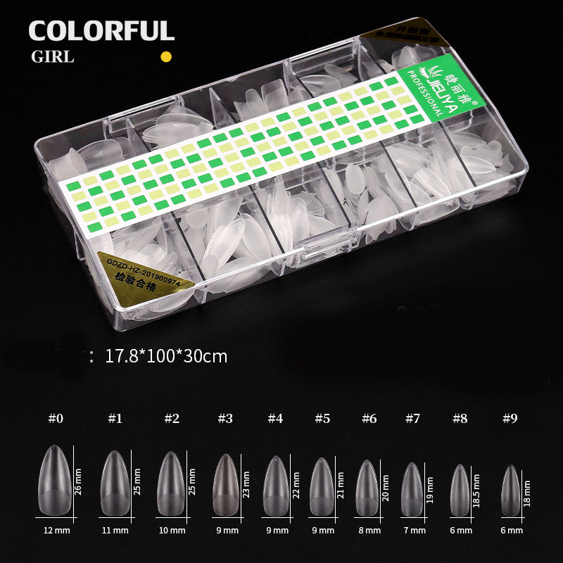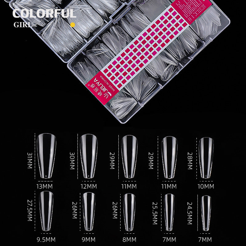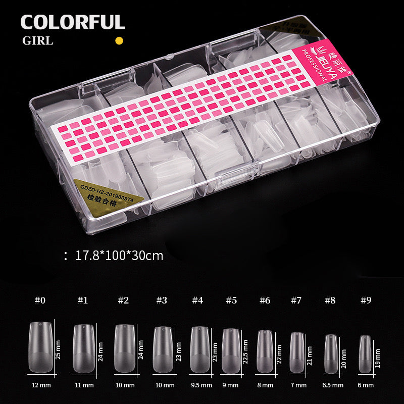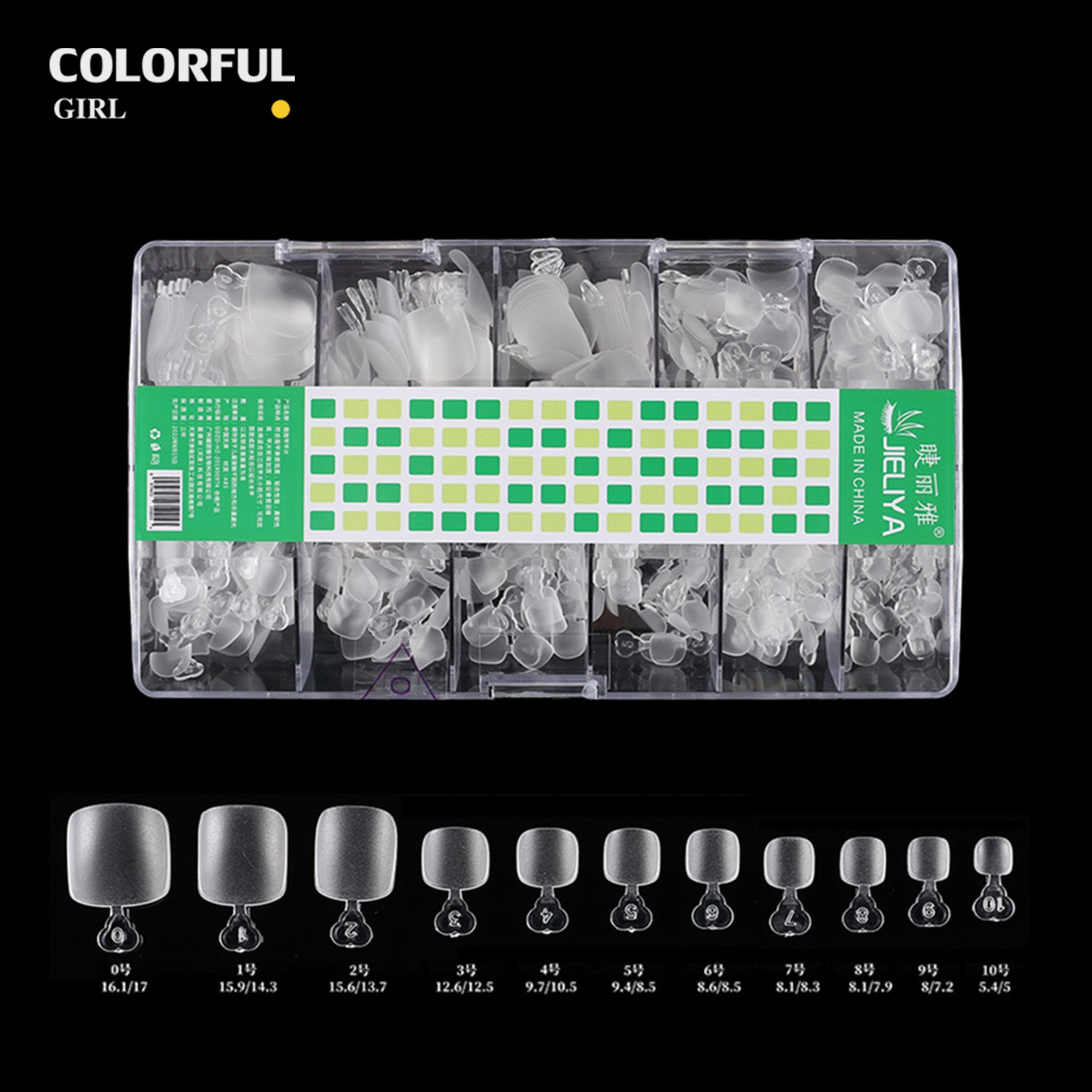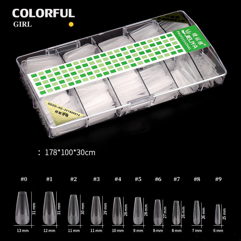 ( มี9แบบ )JIELIYAN บางเฉียบไร้รอย เล็บปลอม pvc ขุ่นไม่ต้องขัด ไม่แตกหักง่าย บัลเล่ต์ เหลี่ยมยาว เหลี่ยม กล่องละ500ชิ้น 9ขนาด พร้อมส่ง