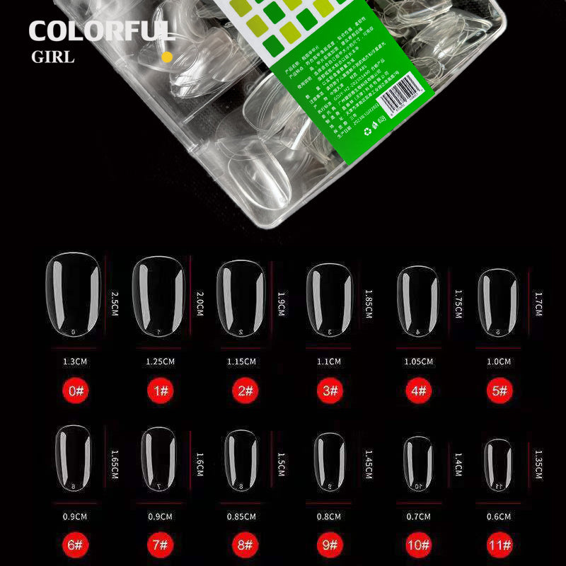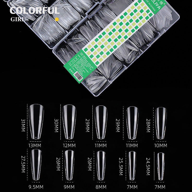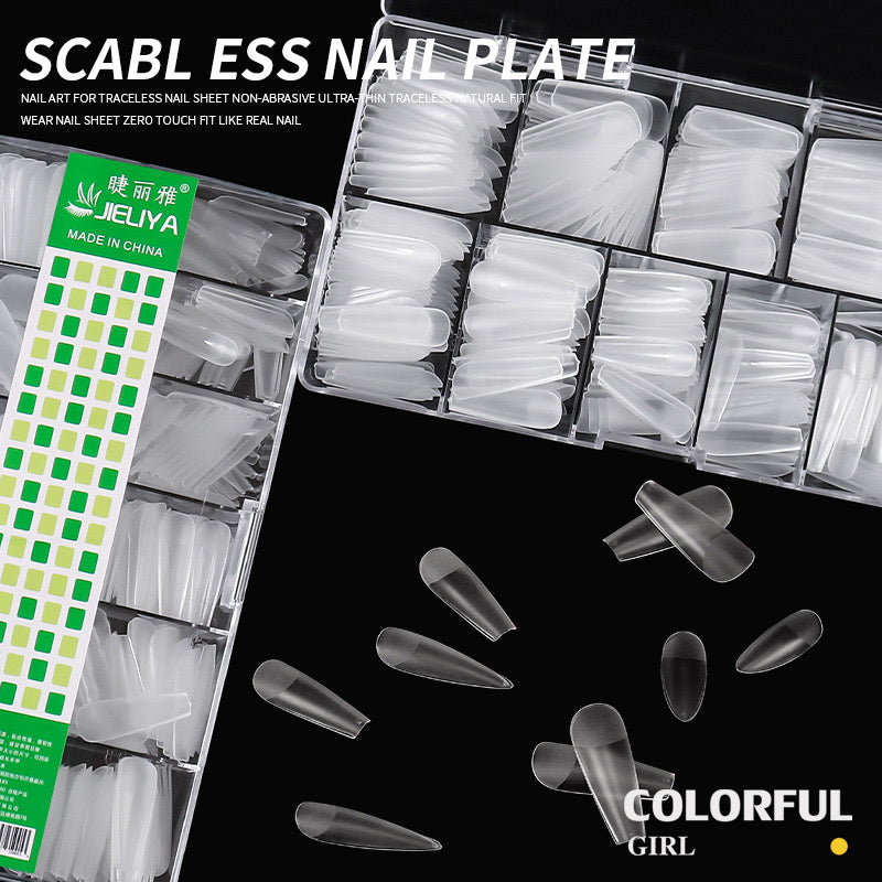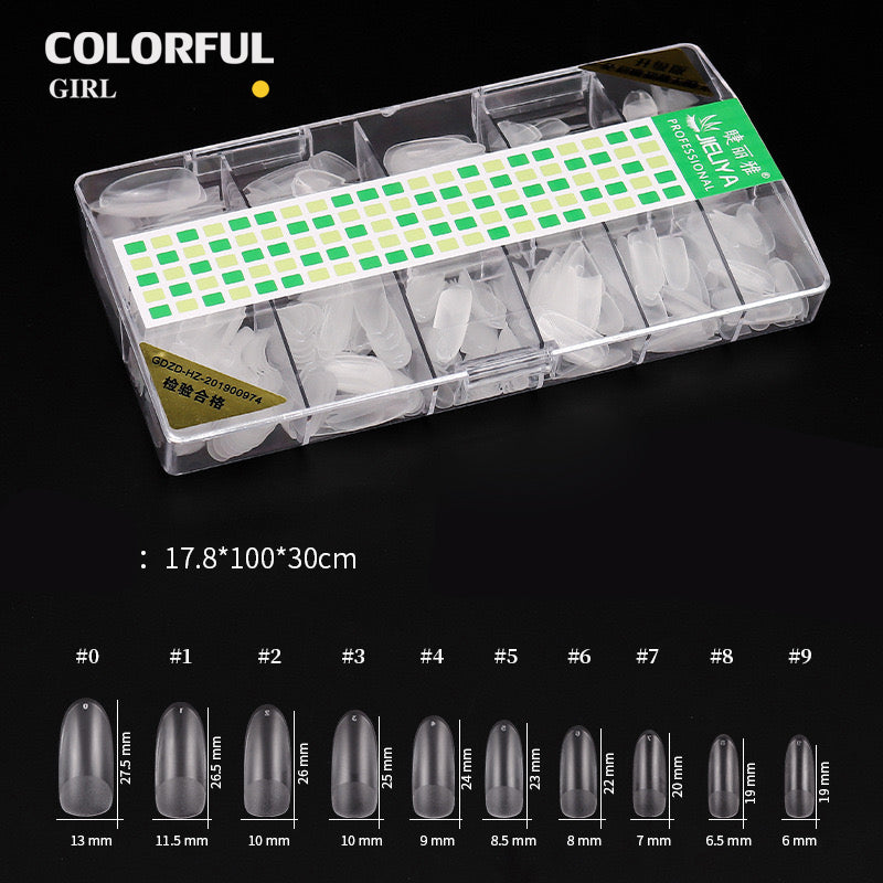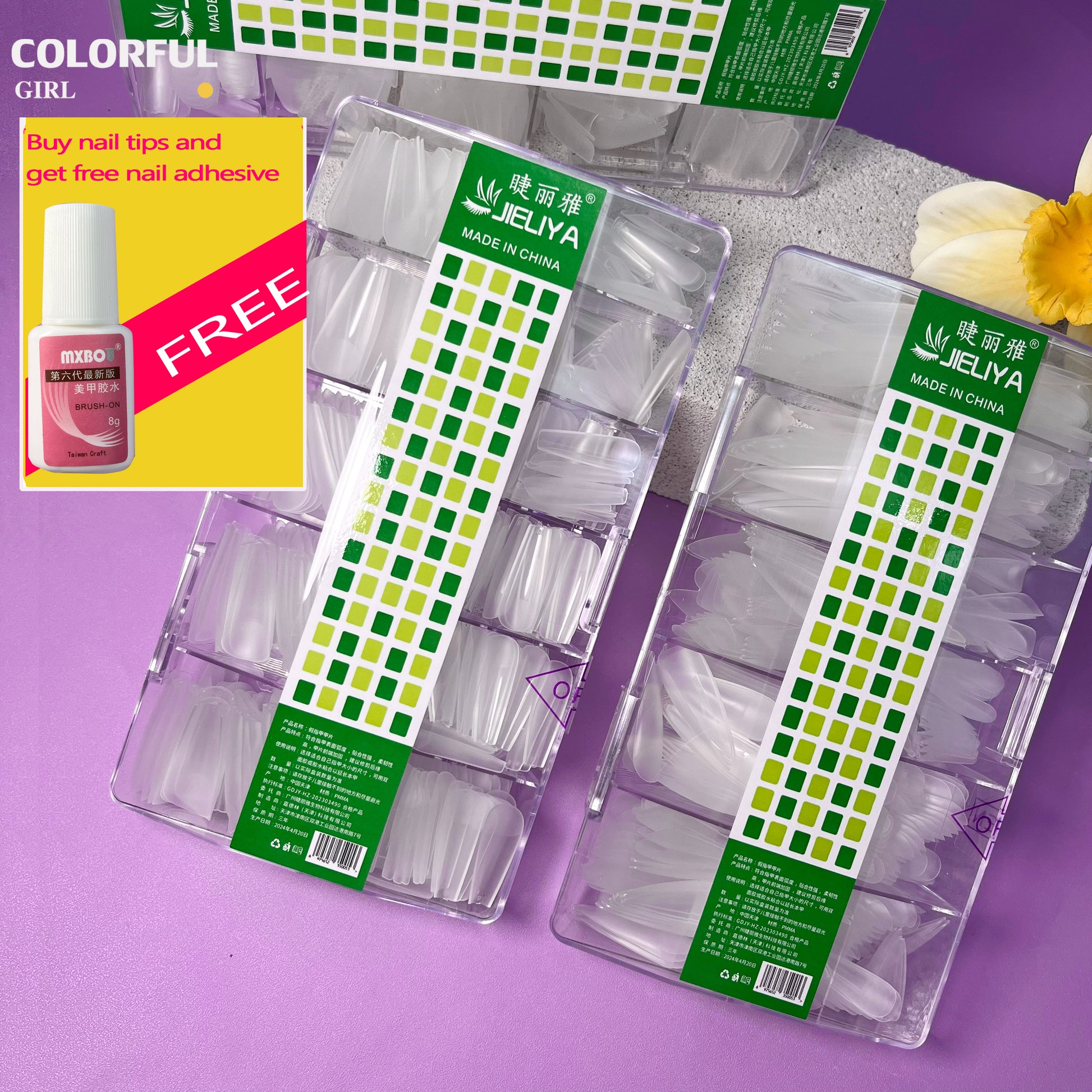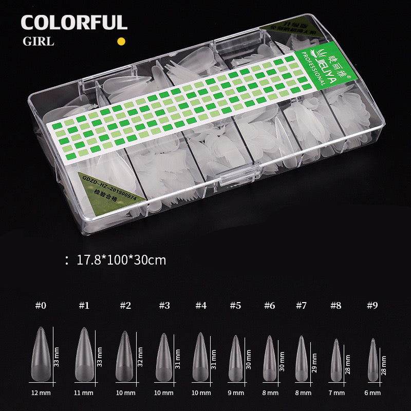 ( มี9แบบ )JIELIYAN บางเฉียบไร้รอย เล็บปลอม pvc ขุ่นไม่ต้องขัด ไม่แตกหักง่าย บัลเล่ต์ เหลี่ยมยาว เหลี่ยม กล่องละ500ชิ้น 9ขนาด พร้อมส่ง