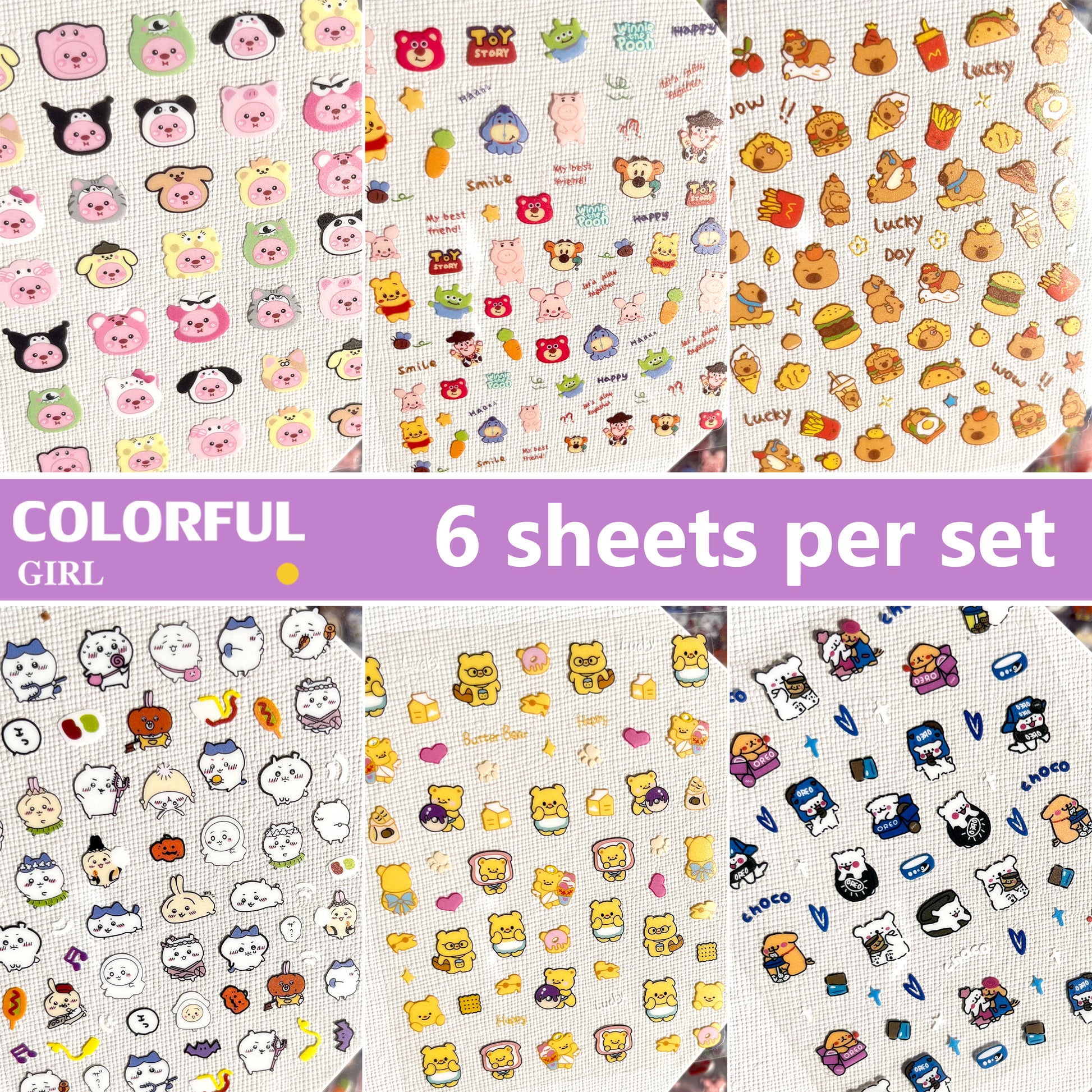 (6ชิ้น/แพ็ค) (1ชิ้น/แพ็ค)น่ารัก Dopamine สติกเกอร์การ์ตูนตุ๊กตาผลไม้ดอกไม้สไตล์ กาวอุปกรณ์ตกแต่งเล็บเครื่องมือ PVC ใส และกันน้ำ ชุด 6 แผ่น