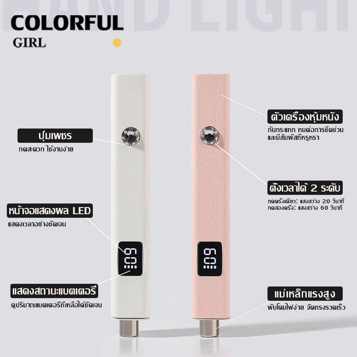 Colorful Girlโคมไฟทำเล็บพกพา 💅 แม่เหล็กดูดแน่น ใช้งานสะดวก ตั้งเวลาอัจฉริยะ 20s/60s แบตฯ 400 mAh 3 W แห้งไว ประหยัดพลังงาน ขาว / ชมพู / ม่วง โคมไฟทรงขีด One-Word ✨