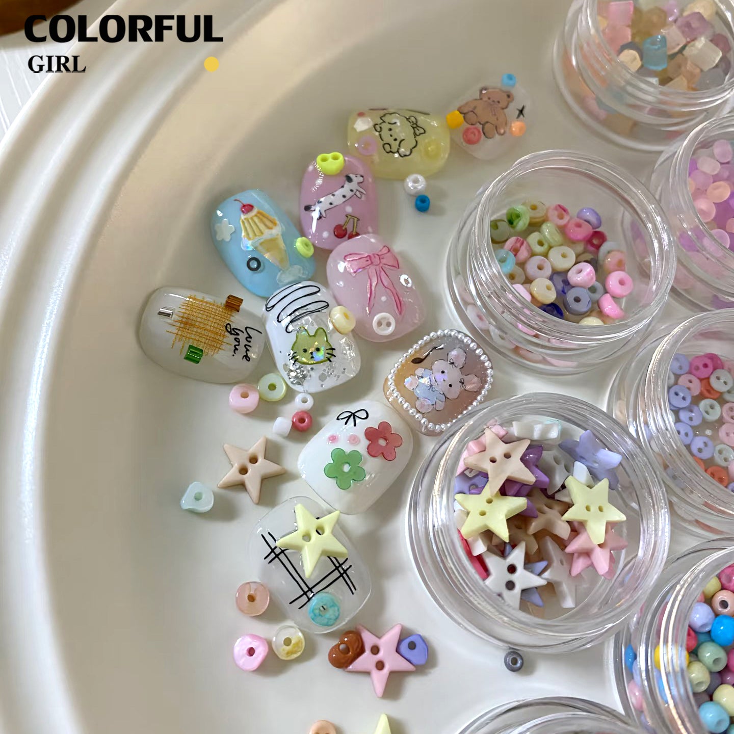 FUN BEADS สไตล์เกาหลี อิน ด้ายสีเค้กริบบิ้นริบบิ้นอุปกรณ์แต่งเล็บน่ารักผสมสีรูปพิเศษน้ําตาลเข็มสีถั่วเครื่องปั้นดินเผานุ่มเครื ลูกปัดตกแต่งเล็บ funbeads พร้อมส่งในไทย