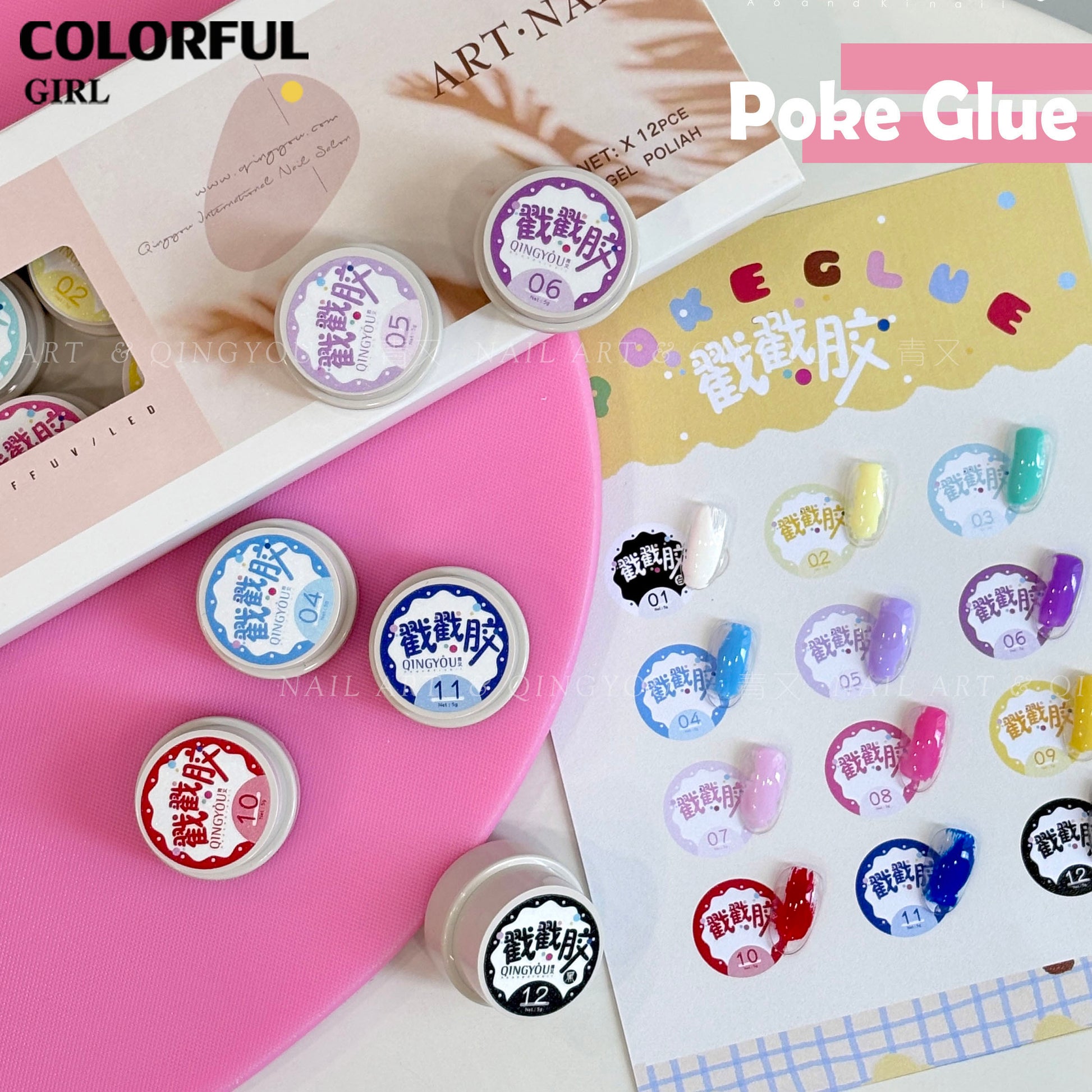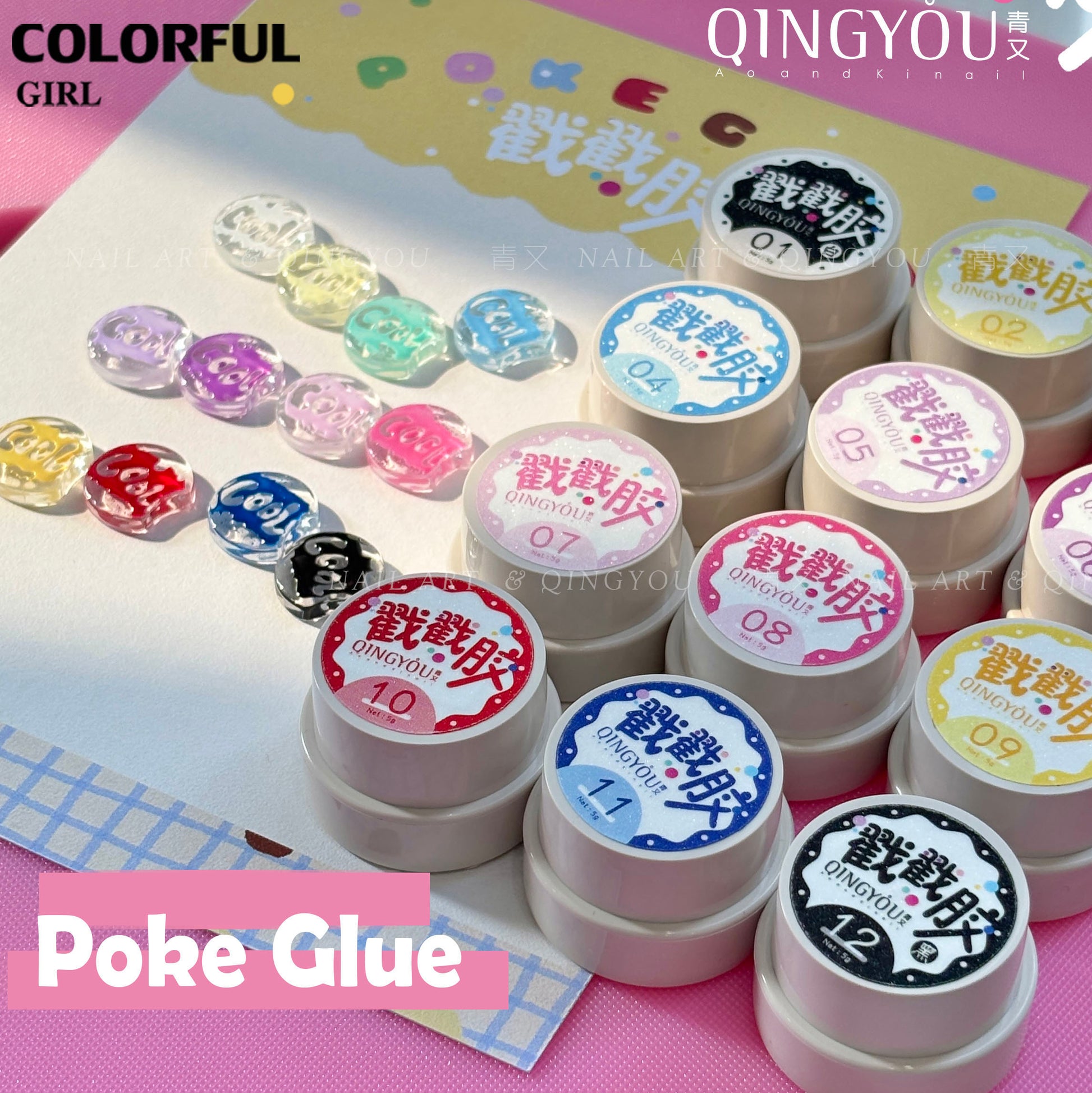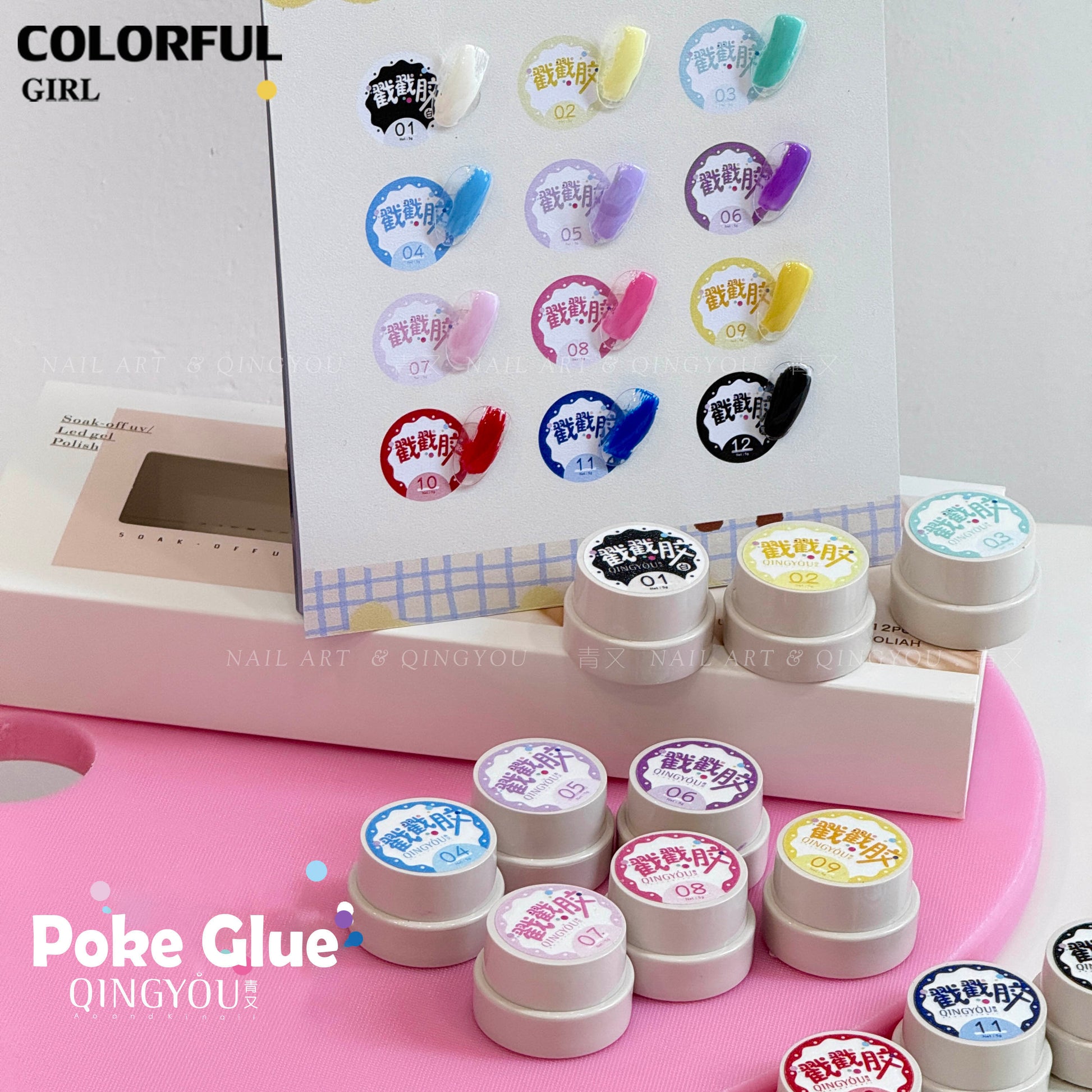 QINGYOU Poke Glue เซ็ตกาวเจลทำเล็บ|เจลสี 12 สีแบบยืดได้ + ไม่หดตัว ไม่หลุดลอก · ลวดลายลูกไม้/คลื่น/ตาข่าย หลากหลายเอฟเฟกต์ · แถมฟรี Poke Glue Base Coat เฉพาะ & คู่มือการใช้งาน