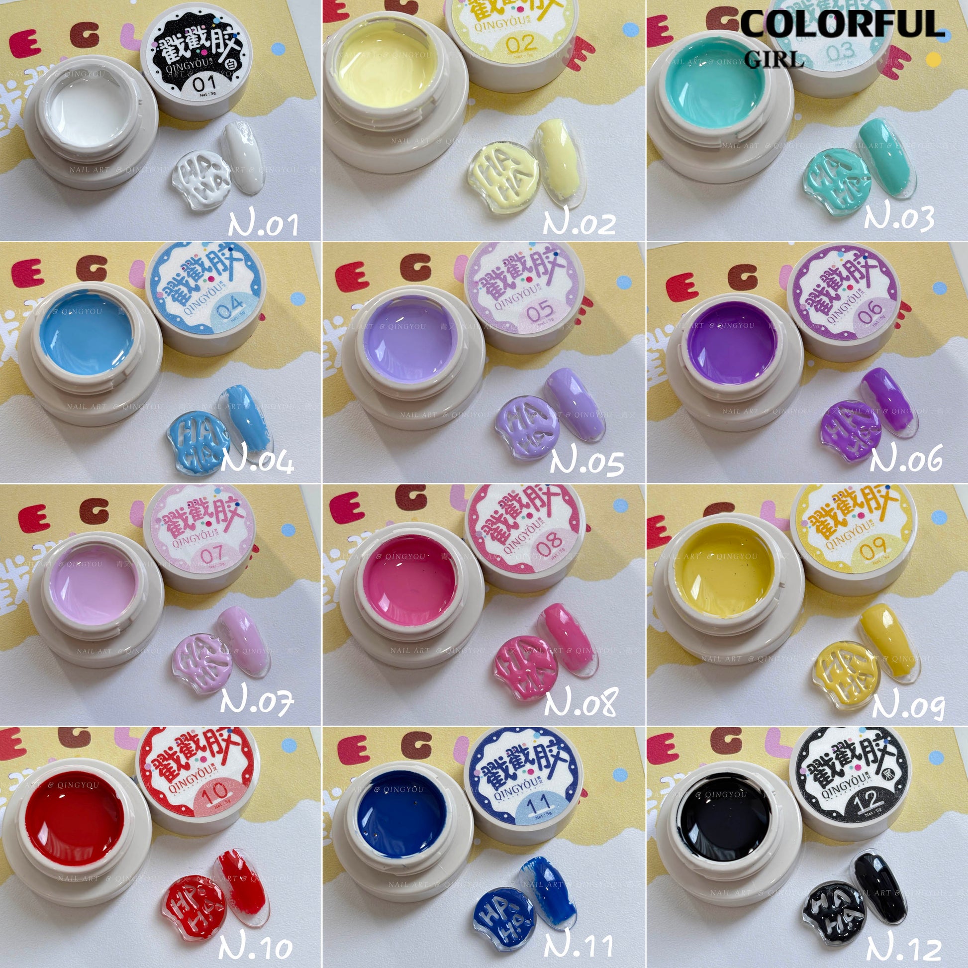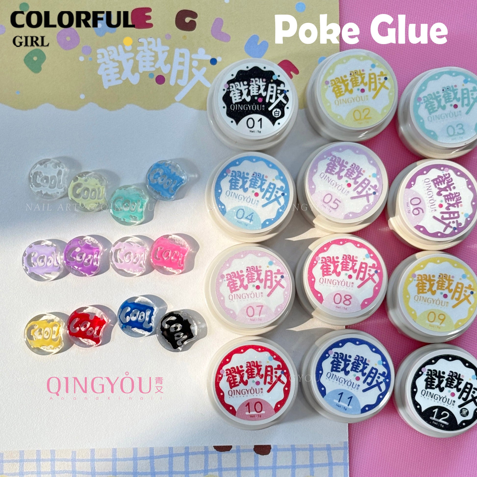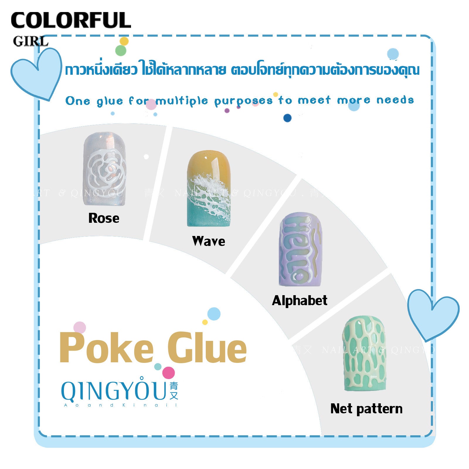 QINGYOU Poke Glue เซ็ตกาวเจลทำเล็บ|เจลสี 12 สีแบบยืดได้ + ไม่หดตัว ไม่หลุดลอก · ลวดลายลูกไม้/คลื่น/ตาข่าย หลากหลายเอฟเฟกต์ · แถมฟรี Poke Glue Base Coat เฉพาะ & คู่มือการใช้งาน