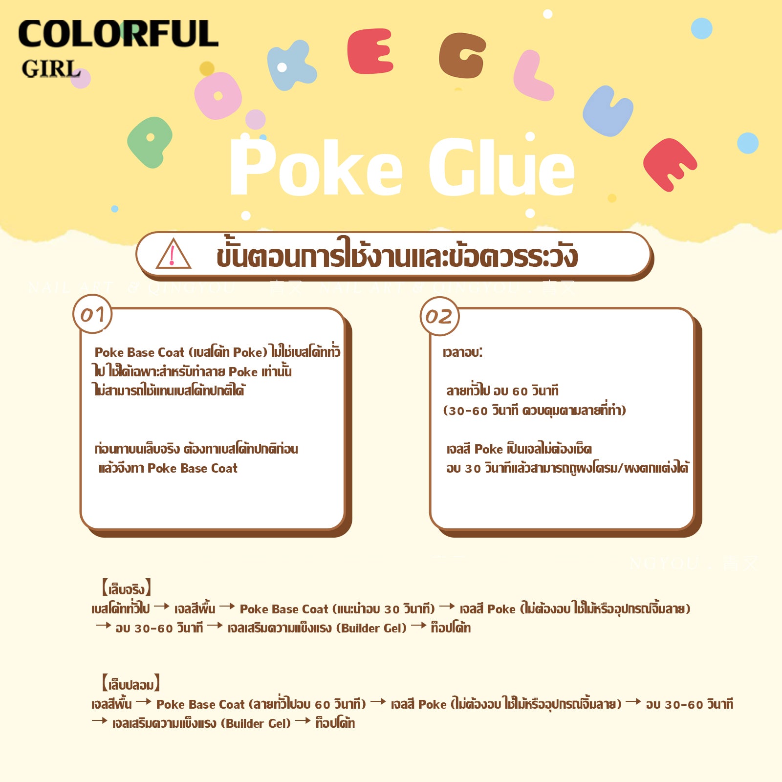 เจลสีพื้น → Poke Base Coat (60 วินาที) → Poke Glue (แตะ/ลากเส้น) → อบ 30–60 วินาที → Builder Gel → Top Coat